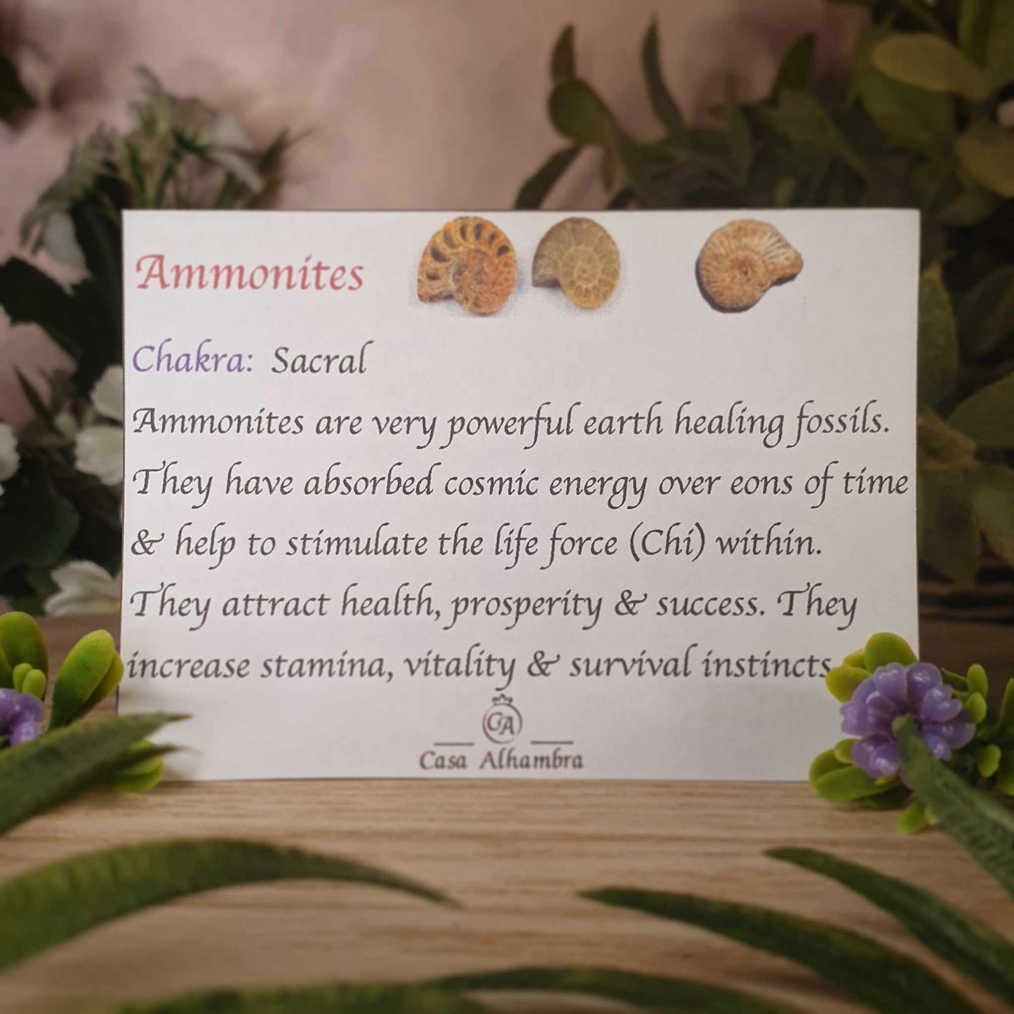 Ammonites are very powerful earth healing fossils. They have absorbed cosmic energy over eons of time and help to stimulate the life force (Chi) within. They attract health, prosperity and success. They increase stamina, vitality and survival instincts.