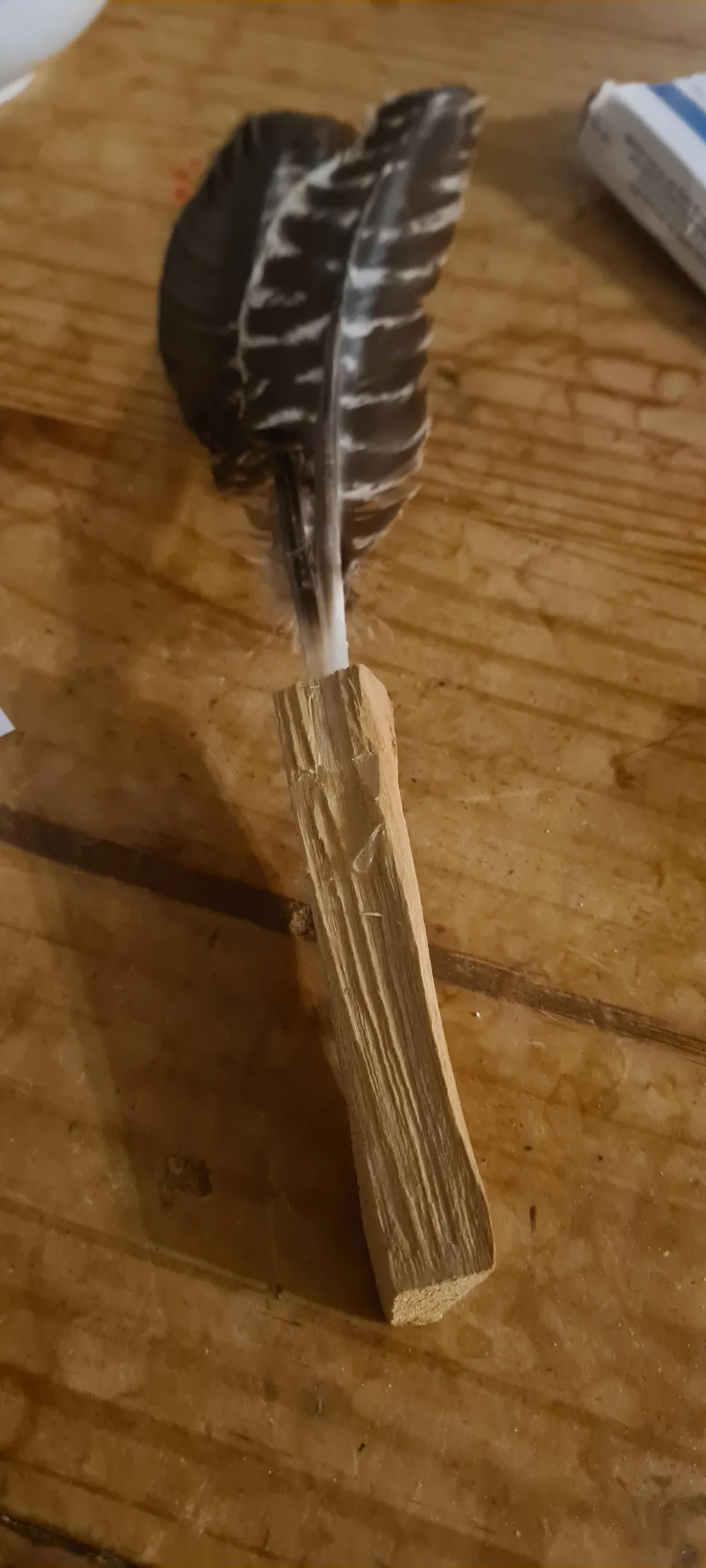 Anonymous It was put in a poor piece of wood, that was unattractive roughly cut uneven. I thought it would have looked and felt if the handle was wrapped in a nice ribbon or even in a tape that was smooth and had gorm. I've yried to carve it into a better shape but it's not a soft would. I would have preferred the feathers on their own.