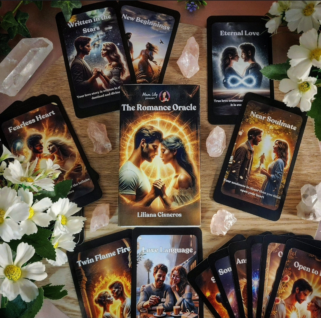The Romance Oracle was created to guide you through the pathways of love, relationships and self-discovery. Whether you are seeking romance, deepening an existing connection or healing from past experiences, this deck serves as a loving companion on your journey.